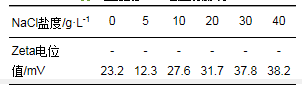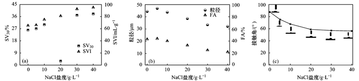 Zeta電位的變化可反映生物絮體穩定性的變化.由表 1可以看出, 當NaCl鹽度由0增加至5 g·L-1時, Zeta電位由-23.2 mV升高至-12.3 mV, 表明污泥絮體較穩定, 生物絮凝性較好.但是, 當NaCl鹽度由10 g·L-1增加至40 g·L-1時, Zeta電位由-27.6 mV下降至-38.2 mV, 污泥絮體表面負電荷降低, 靜電斥力持續增大.雙電層理論表明, 隨著負電荷的增加, 絮體表面靜電斥力提高, 阻礙絮體發生絮凝, 生物絮凝性變差. Wilén等采用FA描述絮凝性時認為, FA越大, 絮凝性越強.