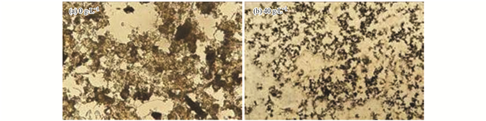 由圖 7(a)可以看出, 當NaCl鹽度為0~5 g·L-1時, SV30約為27%, SVI約為66 mL·g-1, 污泥粒徑約為45.5 μm, 低鹽度下污泥活性有所增強.當NaCl鹽度由10 g·L-1增加至40 g·L-1時, SV30由30%增加至38%, SVI由75 mL·g-1增加至95 mL·g-1, 污泥粒徑由43.7 μm減小至32.1 μm. NaCl鹽度的增加導致污泥絮體松散, 污泥顆粒尺寸減小. 圖 7(b)表明, 當NaCl鹽度為0~5 g·L-1時, FA維持在44%;但是, 當NaCl鹽度為10 g·L-1增加至40 g·L-1時, FA由40%下降至22%. 圖 7(c)表明, 隨著NaCl鹽度增加, 接觸角由87.6°減小至56.3°, 表明污泥親水性逐漸降低.缺氧區污泥的形態由緊密變為疏松, 無明顯聚集形態(圖 8), 絮體中大量的菌體不再緊密連接, 生物絮凝性變差.