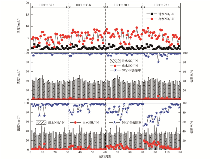 圖 2表示不同HRT條件下NH4+-N、NO2--N及NO3--N的變化.從中可知, 在整個試驗過程中, 進水NO2--N濃度有一定的波動, 但系統對其去除效果良好, NO2--N平均出水濃度均低于0.70 mg·L-1, 這是由于發生厭氧氨氧化后剩余的NO2--N發生了異養反硝化.