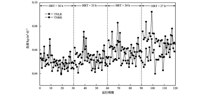 圖 4 不同HRT下ANAMMOX系統中總氮負荷的變化特征蔣軍等采用人工配水, 當HRT為24 h時, TNLR為0.140 kg·(m3·d)-1, TNRR為0.120 kg·(m3·d)-1.李寧寧等控制溫度為36℃, 發現厭氧氨氧化反應達到穩定運行時最佳HRT為24 h, TNLR平均為0.179 kg·(m3·d)-1, TNRR為0.125 kg·(m3·d)-1.而本試驗中, 當HRT為33 h時, TNLR及TNRR較上述研究低, 這是因為: ①本試驗采用SBR處理實際生活污水, 在實現半亞硝化時, 以其出水作為厭氧氨氧化的進水, 故厭氧氨氧化系統中含有一定量的AOB及DO, 且在有機物的沖擊負荷下, 厭氧氨氧化反應協同反硝化去除系統中的TN; ②由于控制溫度為24℃, 可能抑制了厭氧氨氧化菌的活性, 但是該溫度下對實際工程有較大的指導意義.