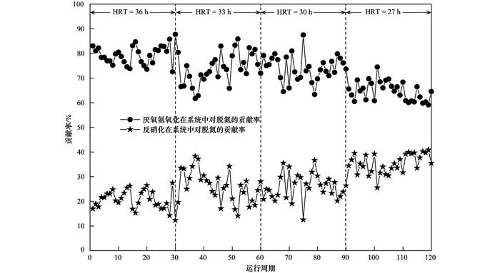 由圖 6可知, HRT為36 h時, 厭氧氨氧化在系統中對脫氮的平均貢獻率為79.36%, 異養反硝化在系統中對脫氮平均貢獻率為20.64%, 此時厭氧氨氧化占據優勢地位.當HRT縮短至27 h時, 厭氧氨氧化在系統中對脫氮的平均貢獻率降至67.12%, 反硝化在系統中的脫氮平均貢獻率升至32.88%.隨著HRT的逐漸縮短, 厭氧氨氧化對脫氮貢獻率緩慢降低, 反硝化在系統中對脫氮貢獻率逐漸增加, 主要是因為, 試驗污泥取自成功啟動的厭氧氨氧化中的活性污泥, 故剛開始反應以厭氧氨氧化為主, 隨著系統的逐漸運行, 反硝化菌利用進水中的COD發生異養反硝化脫氮, 研究結果與李媛[21]的研究結果一致.還有研究證明, 厭氧氨氧化菌與反硝化菌能在同一個反應器內共存, 反硝化菌利用有機物將反應器內的NO3--N轉化為N2, 可解除有機物對厭氧氨氧化的抑制作用; 同時反硝化產生的CO2還可為厭氧氨氧化提供無機碳源, 兩者可實現協同作用.