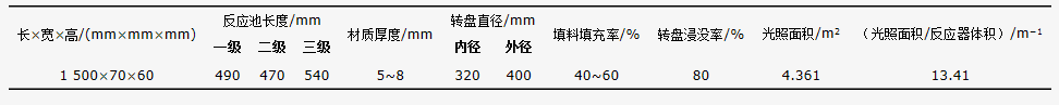 本實驗選用自行設計裝置(新型三級藻菌生物接觸轉盤反應器),流程裝置見圖1,主要由一沉池、一級、二級轉盤等15個部分構成。選取耐高溫有機玻璃材質,呈長方體,焊接鐵架支撐,底部閥門用于反應器的清洗與放空。內部填料、外部幅板構成生物轉盤的主體,其內部是鐵絲網包圍而成的柱狀空腔,腔體被布滿圓孔的矩形有機玻璃板平分為5個區域,填料均勻布設在每個小腔室內,設置幅板與水平方向成60°角。該轉盤選用氣體驅動,電磁式空氣壓縮機提供驅動力,氣棒用橡膠吸盤固定于各級反應池底部的后端位置,控制轉盤轉速。鑒于天氣變化,為滿足微藻的生長需要,選用品牌三防燈為強化光源,燈管均分、平鋪于裝置底部,水平間隔245 mm,全天持續照射。中空纖維膜組件鑲嵌于三級反應裝置中,以進一步保持反應器內藻生物量,避免隨出水流出。裝置主要參數如表1所示。