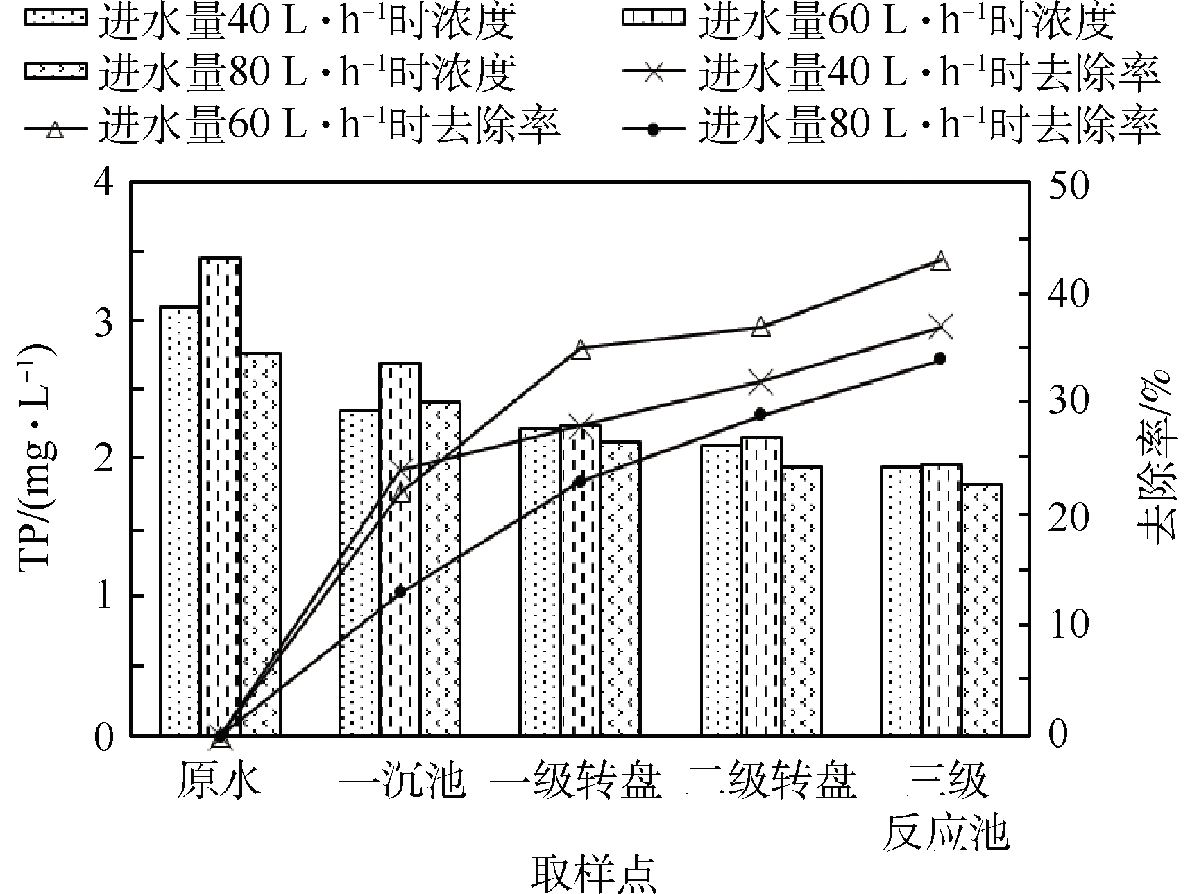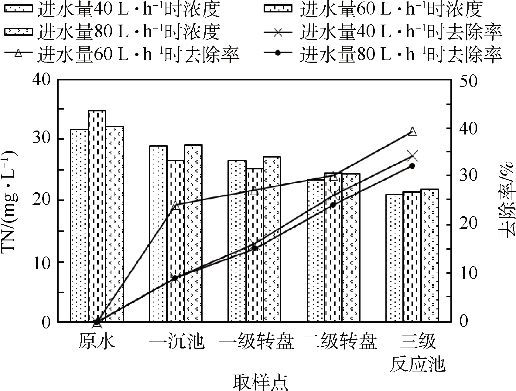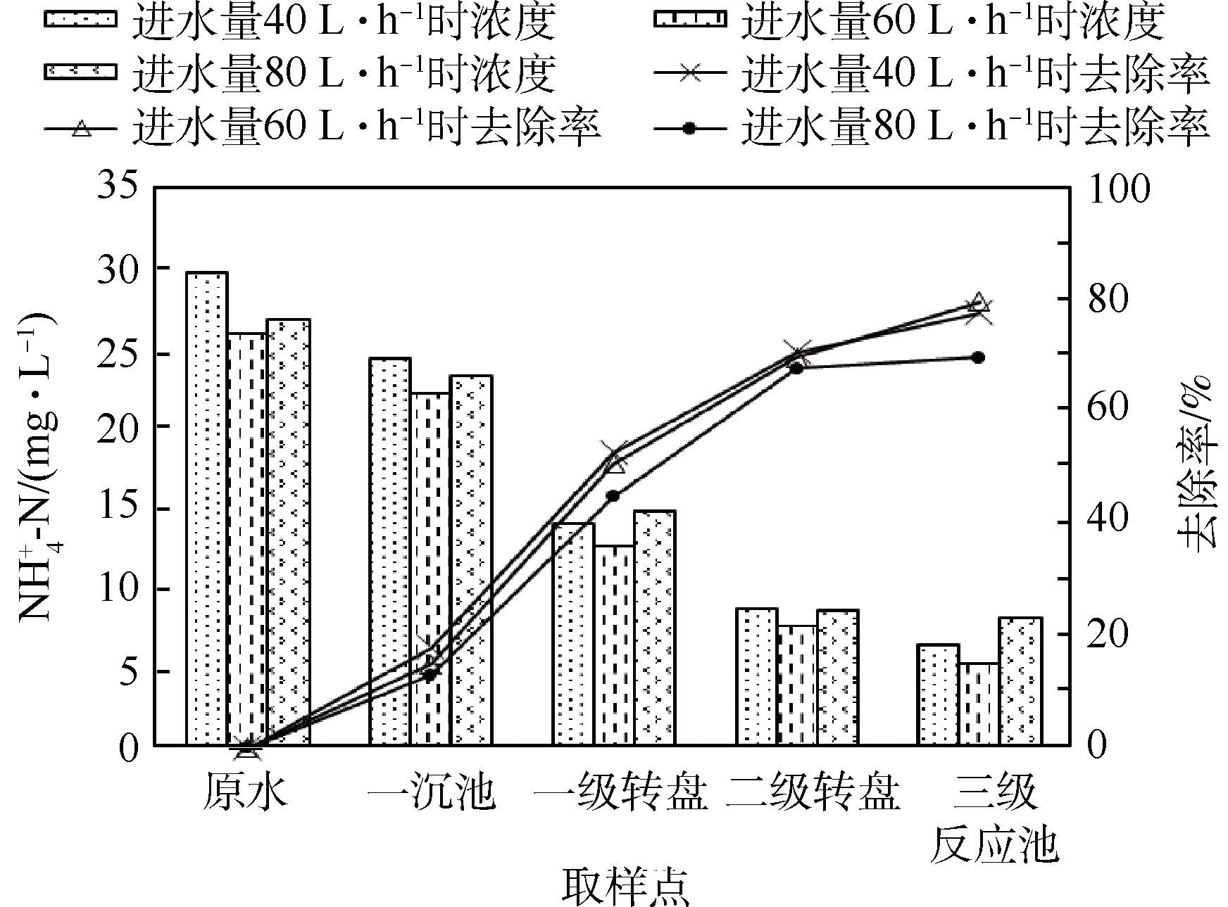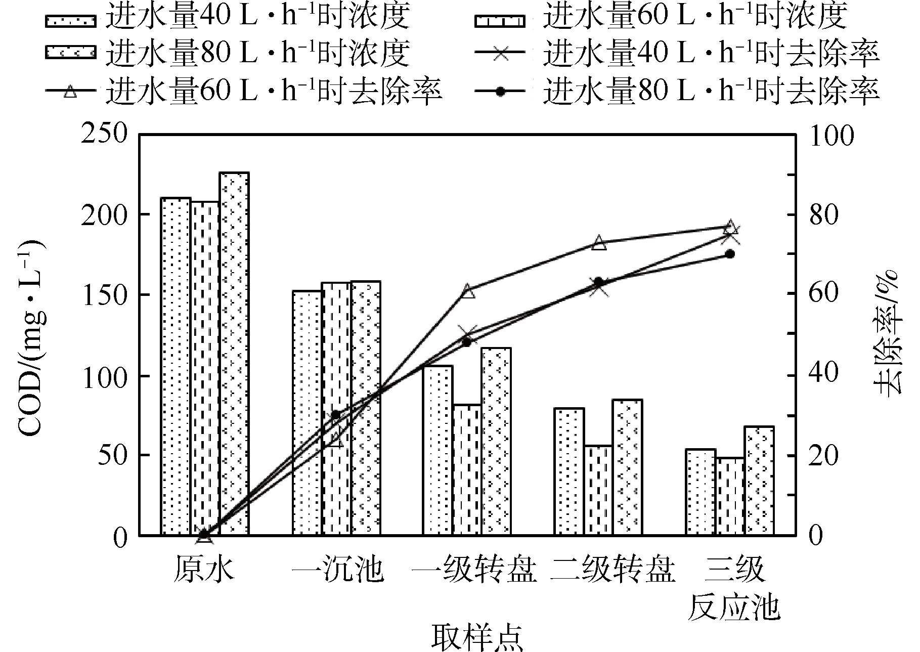 每天上午9點測量反應器的運行參數,取平均值。溫度24.9 ℃、自然光照強度16 663 lx、燈管3支,光強5 500~12 000 lx、轉盤進氣壓0.011 5 MPa、一級轉盤轉速1.32 r·min−1、二級轉盤轉速1.73 r·min−1。在此環境下,考察進水流量40、60和80 L·h−1,對應有機負荷(以COD計)為1.75、2.71、3.63 kg·(m3·d)−1時,反應器中一沉池、一級轉盤、二級轉盤和三級反應池對各污染物的去除效能。