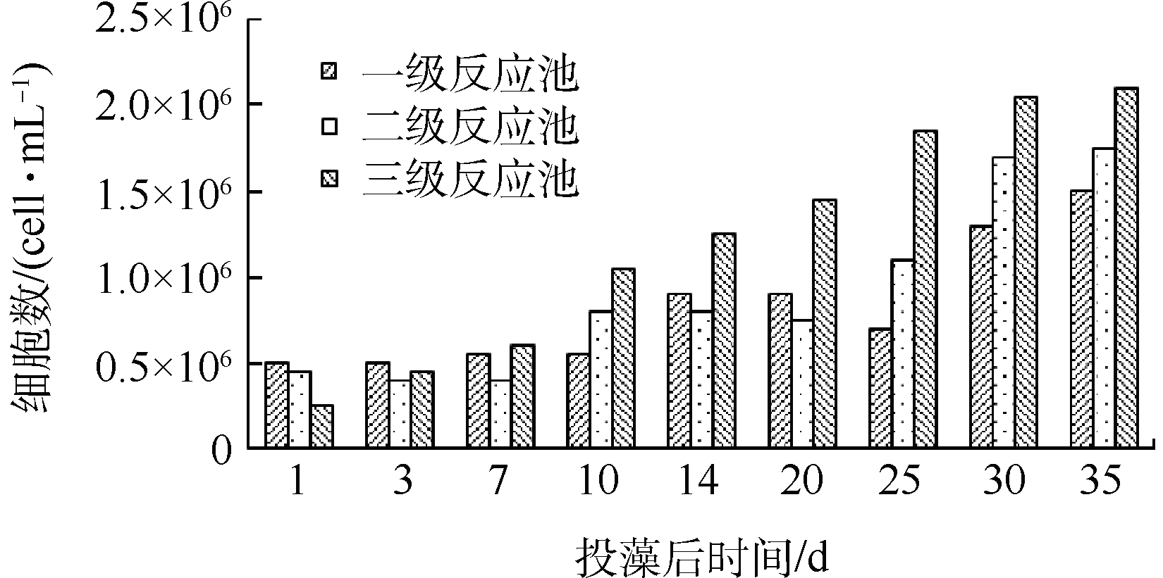 按既定實驗,微藻后期擴大培養應在室外的玻璃箱進行。實驗開展后發現,經封閉的玻璃箱仍受外界環境污染,誘發藻類產生團聚現象。細胞濃度峰值達到1.00×107 cell·mL−1,選定此濃度作為本實驗藻的飽和細胞濃度。5次共投加的總藻液折算為飽和濃度后為30.5 L,體積占反應器總體積的9.4%。假設反應器內的藻液實現完全混合分布,則理論初始藻細胞濃度應為9.4×105 cell·mL−1,在藻濃度最大的一級反應池中,實際藻濃度與理論值相差甚遠,可能是由于部分微藻被污泥所包裹或吸附在反應池壁引起的。反應器內的藻細胞濃度隨時間變化情況如圖7所示,30 d后3個反應池內藻細胞濃度分別為1.50×106、1.75×106和2.10×106 cell·mL−1,表明外加光源對微藻生長有一定的促進作用,但仍未達到相同條件下室外玻璃箱培養的飽和濃度,可能是因為光強不足。