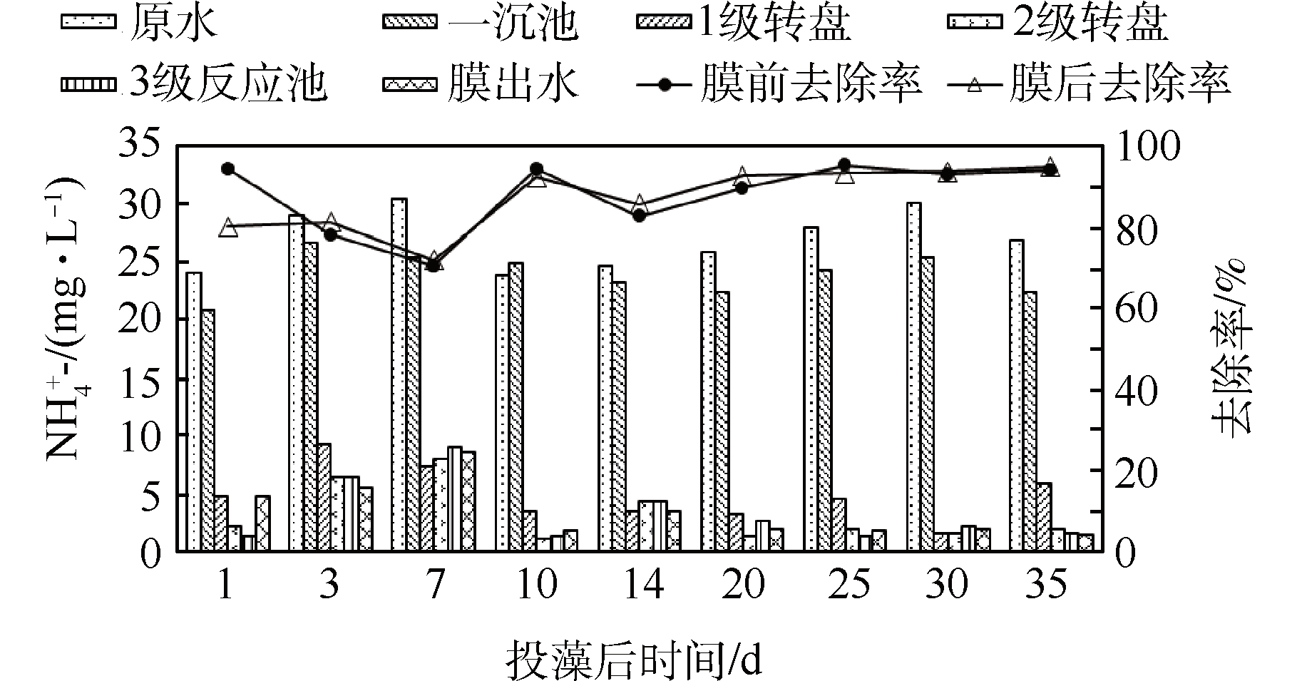 NH4+-N的膜前和膜后平均去除率分別為87%和88%,如圖10所示。由于離心時除去了大部分影響NH4+-N值的大顆粒有機物,因此膜前和膜后去除率都較為穩定。膜后去除率比膜前去除率高時,由于微藻對氮的吸收作用,經過膜對藻體的截留作用,膜后出水中不含微藻,故NH4+-N的去除率提高。
