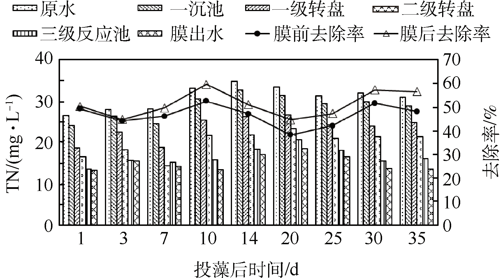 TN的膜前和膜后去除率如圖11所示。微藻會吸收污水中的氮用于生長,從而對TN的去除起促進作用,但從實驗數據來看,這種效果不夠明顯,投加微藻后TN的去除率變化有限。可能是因為低濃度微藻可吸收氮量有限,或是離心時藻細胞破裂導致吸收的氮又釋放到了水中。