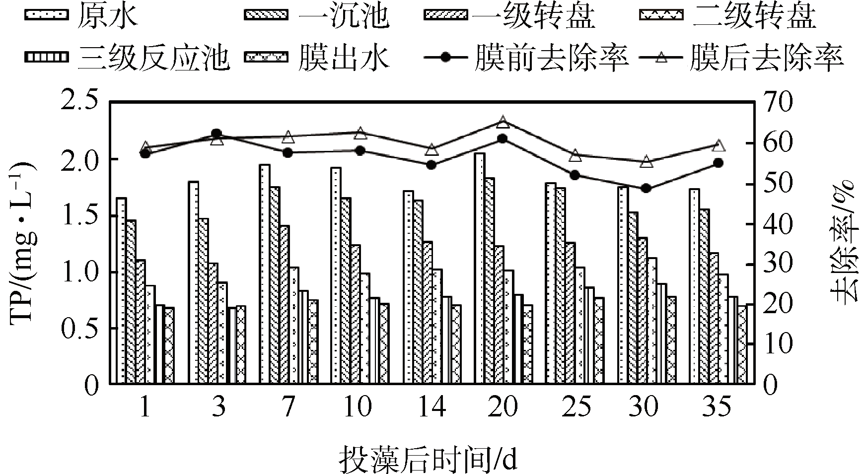TP的膜前和膜后去除率如圖12所示。TP的去除率較低可能是因為反應器內無明顯厭氧區且運行期間不排泥所致。理論上投加微藻后,TP的去除率應得到提高,但從實驗數據來看并無明顯效果,同TN的去除相似,這可能是因為微藻的濃度較低或離心導致藻體破裂所致。