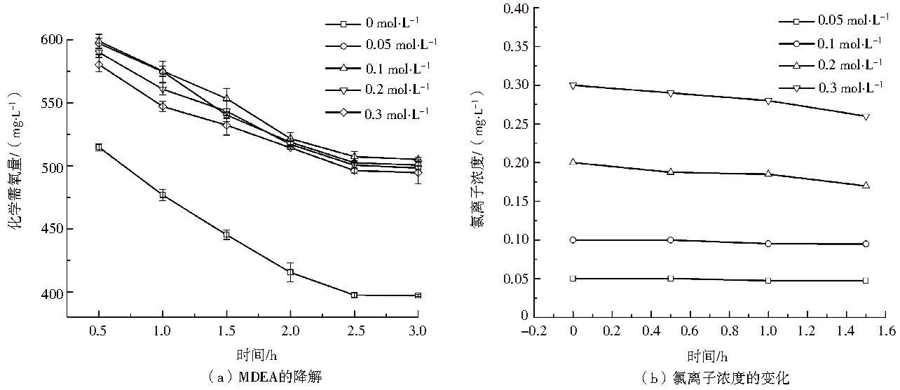 圖1 Cl−對MDEA降解的影響及對應(yīng)Cl−濃度的變化