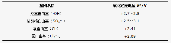 當(dāng)濃度偏高時(0.1~0.3 mol·L−1),由于副反應(yīng)(2)存在,體系中產(chǎn)生的Cl·、Cl2−·這些氯離子自由基也相應(yīng)增多,這些氯離子自由基同樣具有不俗的氧化能力,能夠一定程度降解MDEA,其自由基氧化還原電位見表 1,從而緩解了氯離子對MDEA降解的抑制作用,因而體系COD去除率又有所提高。