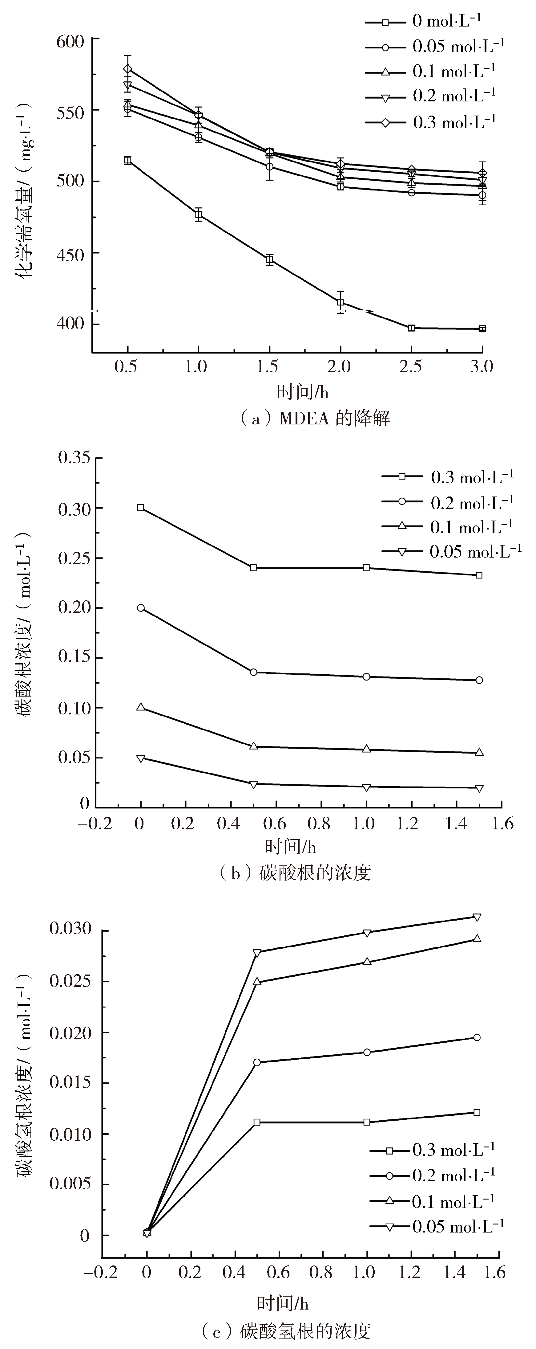 圖3 HCO3−對MDEA降解的影響及對應(yīng)CO32−與HCO3−濃度變化