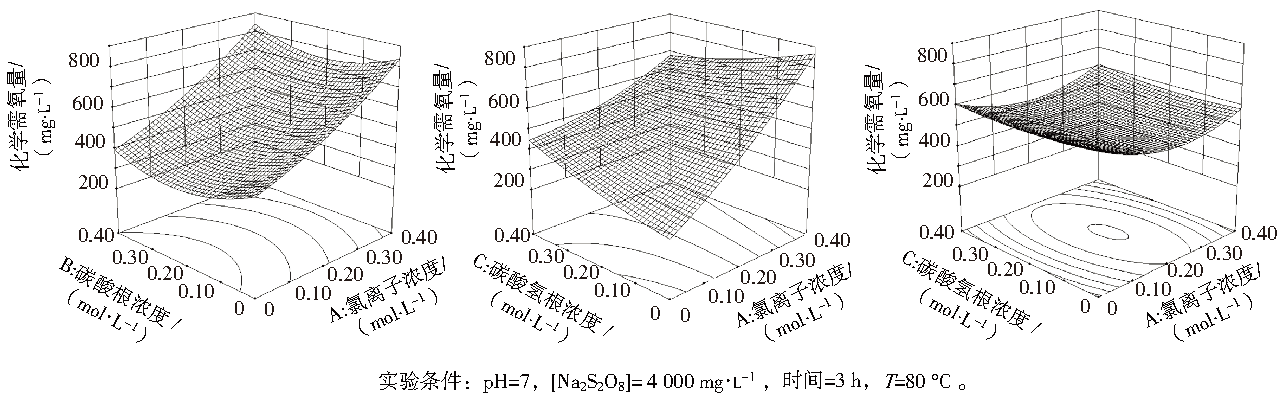 式中:A為氯離子濃度,mol·L−1;B為碳酸根離子濃度,mol·L−1;C為碳酸氫離子濃度,mol·L−1;并對該模型進行方差分析,R2為0.985 7,說明模型是顯著的,其中氯離子影響最為顯著。在此基礎(chǔ)上,利用Design-Expert軟件進行作圖,獲得Cl−、CO32−、HCO3−中兩兩因素之間的交互作用對以COD為響應(yīng)值的響應(yīng)曲面圖,結(jié)果見圖5。