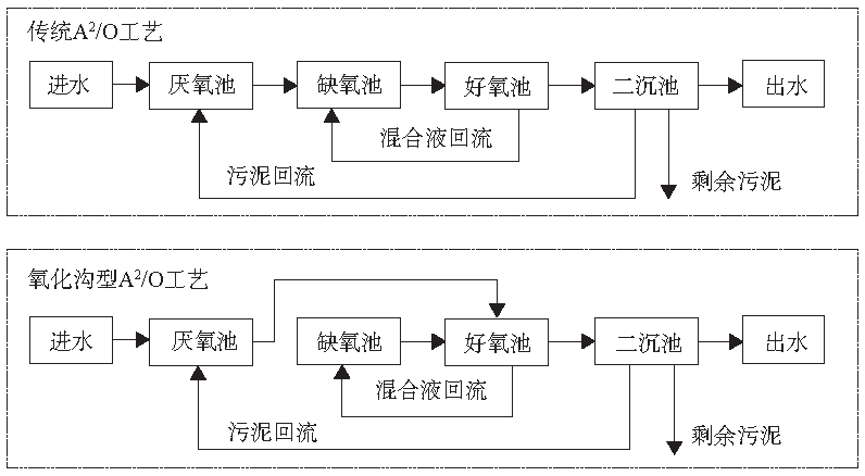 圖2 傳統A2/O工藝和氧化溝型A2/O工藝流程圖