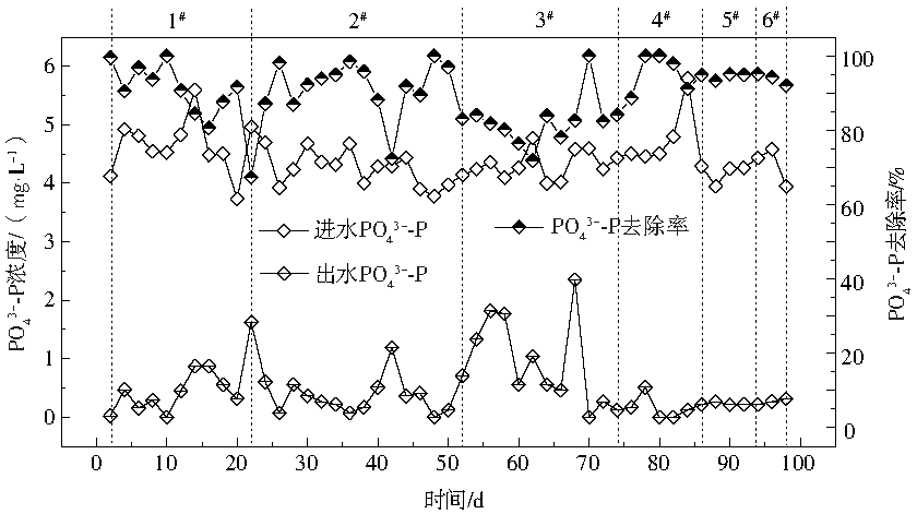 通常情況下,污水中的PO43−-P通過厭氧釋磷-好氧過量吸磷的途徑被儲存在微生物細胞內而被除去。在A2/O工藝中,回流污泥中帶來的聚磷酸鹽首先在厭氧段被釋放為PO43−-P,然后PO43−-P在好氧段被微生物過量吸收而被除去。如圖6所示,傳統A2/O工藝和氧化溝型A2/O工藝在各種運行條件下均得到了良好的除磷效果,PO43−-P平均去除率為89.69%。除傳統A2/O工藝的3#工況外,出水PO43−-P濃度大都低于0.5 mg·L−1,平均為0.36 mg·L−1。在傳統A2/O工藝的3#工況中,由于污泥濃度較低(表4),潛在地削弱了系統的生物除磷功能。傳統A2/O工藝3#工況的出水PO43−-P平均濃度為0.93 mg·L−1。由于傳統A2/O工藝在一定程度上依靠在缺氧環境中發生的反硝化吸磷反應實現生物除磷,混合液回流比的降低(表4)也導致在缺氧段通過反硝化吸磷作用去除的PO43−-P減少,從而導致出水PO43−-P濃度升高。已有研究表明,A2/O系統在一定條件下可實現生物反硝化除磷,但需要注意缺氧段硝酸鹽負荷的控制。WANG等發現,在A2/O系統中缺氧區硝酸鹽濃度為1~3 mg·L−1時,A2/O系統中可發生明顯的反硝化除磷現象,且此時的反硝化除磷作用對系統整體除磷貢獻最大,對應的內循環比約為300%~350%。因而本實驗中傳統A2/O工藝3#工況中的混合液回流比(100%)可能過低,未能為缺氧區提供足夠的NO3−-N來刺激反硝化除磷反應的發生。因此,若要在缺氧區利用反硝化除磷反應提高系統生物除磷效率,A2/O系統的混合液回流比不能過低。但此回流比也不能過高,因為過多的混合液回流至缺氧區將為缺氧區帶去過多的DO,使得聚磷菌優先使用O2作為電子受體聚磷,從而抑制反硝化聚磷菌利用NO3−-N或NO2−-N作為電子受體的吸磷反應,達不到聚磷同時反硝化的“一碳兩用”效果。