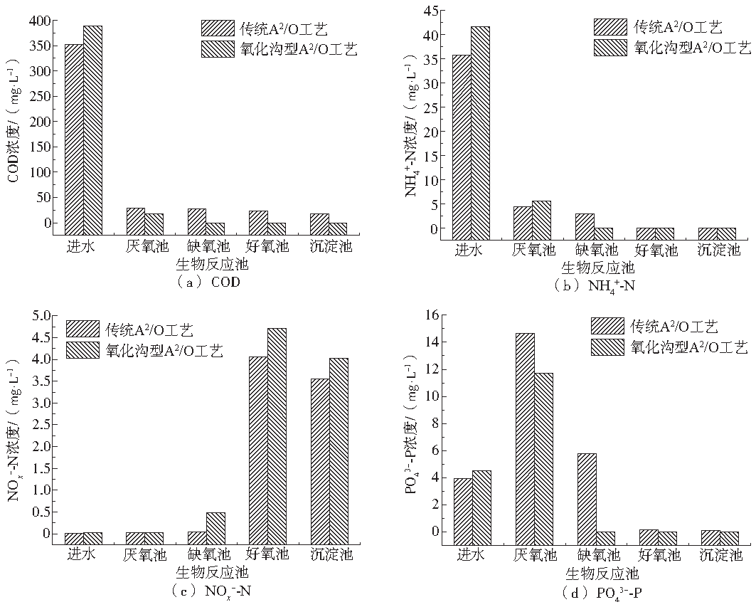 通過2.1節的分析可知,傳統A2/O工藝和氧化溝型A2/O工藝在多種運行工況下均取得了良好的有機物和營養物去除效果,在進水為模擬城市生活污水的情況下,出水COD、NH4+-N、TN和TP(全部為PO43−-P)等各項水質指標均可滿足國家《城鎮污水處理廠污染物排放標準》(GB 18918-2002)[24]一級A要求。因此,本研究選取了傳統A2/O工藝的2#工況和氧化溝型A2/O工藝的4#工況的運行結果作為研究對象,分析了2種工藝在典型運行工況下的污染物去除特征,2種工藝中的COD、NH4+-N、NOx−-N和PO43−-P反應過程見圖7。