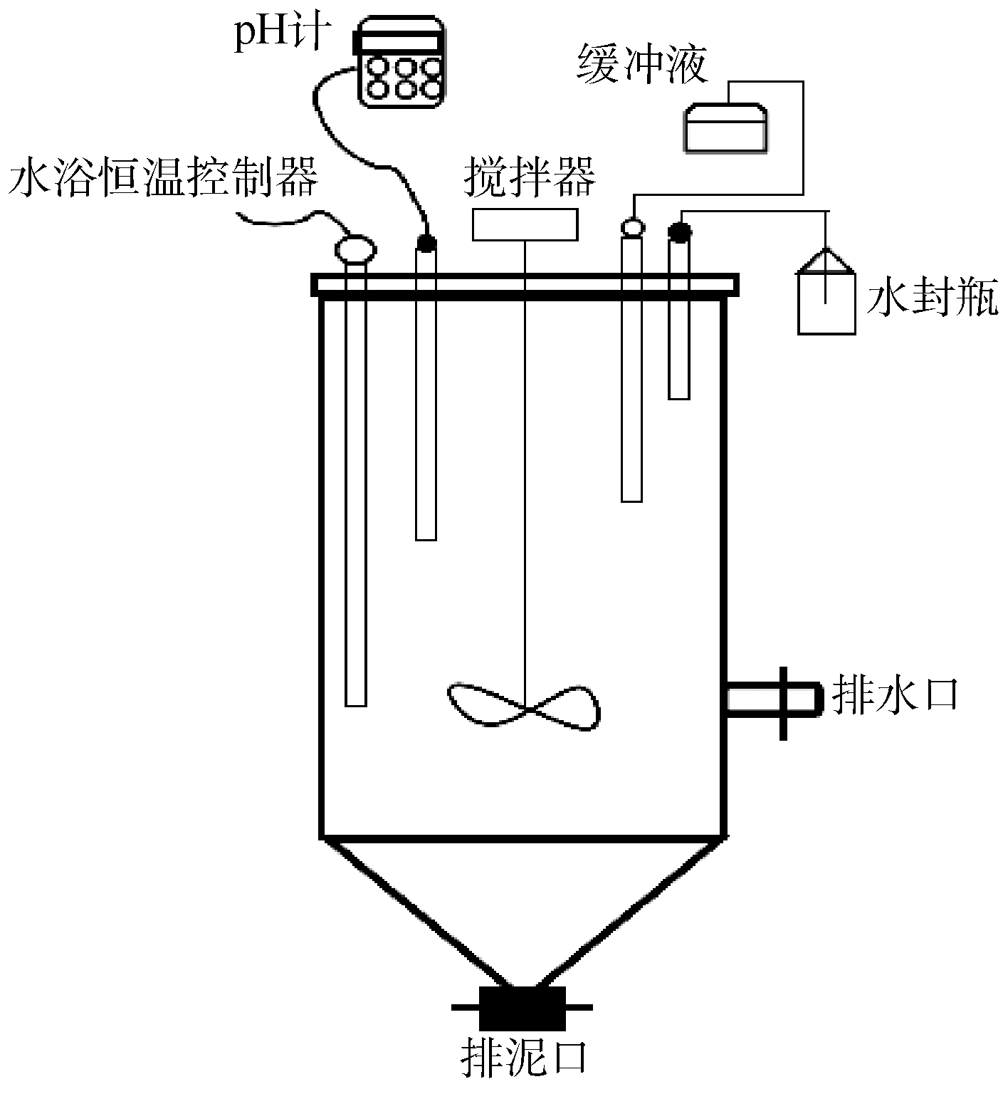 實驗裝置為ASBR(anaerobic sequencing batch reactor)(見圖1),由有機玻璃制成,直徑為14 cm、高為45 cm,有效容積為5 L。取樣口位于反應器壁的垂直方向,在其底部設置有排泥口,上部設有通氣口,反應產生的氣體經過水封瓶后排出。整個反應器用黑色塑料布覆蓋,以避免光照對厭氧氨氧化污泥造成不利影響。