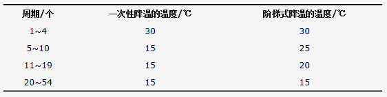 ASBR為間歇式運行,周期為280 min,包括進水5 min,反應240 min,沉淀30 min,排水5 min,每天運行2個周期,各反應過程均采用自動控制系統實現。本實驗采用一次性降溫和階梯式降溫2種模式,見表2。