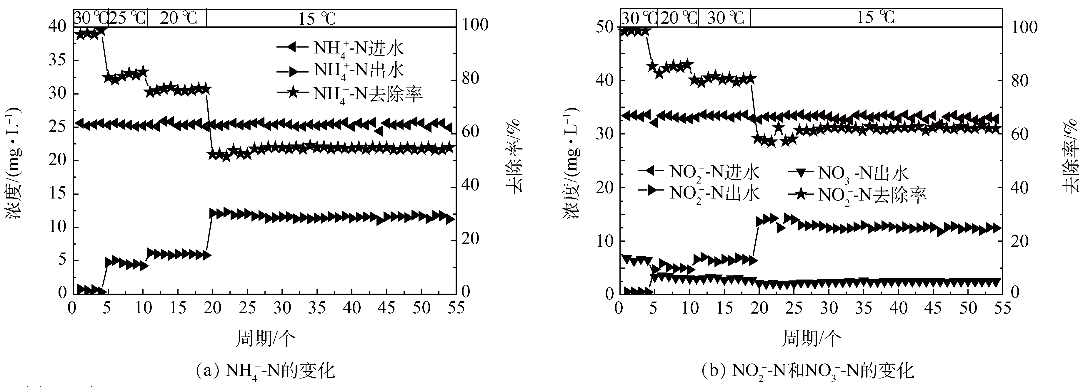 圖3為階梯式降溫過程中NH4+-N、NO2−-N和NO3−-N濃度的變化情況,進水NH4+-N和NO2−-N濃度分別為(25.0±0.4) mg·L−1和(33.0±0.4) mg·L−1。1~4周期溫度為30 ℃,5~10周期溫度為25 ℃,11~19周期溫度為20 ℃,20~54周期為15 ℃。在30 ℃時,出水平均NH4+-N和NO2−-N濃度分別為0.6 mg·L−1和0.5 mg·L−1,平均去除率分別為97.8%和98.5%。在25 ℃時,出水平均NH4+-N和NO2−-N濃度為4.5 mg·L−1和4.8 mg·L−1,平均去除率分別為81.4%和84.2%。在20 ℃時,出水平均NH4+-N和NO2−-N濃度分別為6.2 mg·L−1和6.8 mg·L−1,平均去除率分別為76.3%和79.7%。在15 ℃時,出水平均NH4+-N和NO2−-N濃度為12.1 mg·L−1和12.8 mg·L−1,平均去除率分別為51.6%和61.2%。在階梯式降溫下,每次降溫后出水NH4+-N和NO2−-N濃度均呈現上升的趨勢,平均去除率逐級降低,且降低幅度逐漸加大,反應器重新達到穩定運行所需的時間逐漸變長。溫度降低后,微生物能夠逐步適應低溫,厭氧氨氧化菌的活性逐步得到恢復?刂茰囟群愣,系統的脫氮性能會隨著運行時間的推移而上升,最后達到一個新的穩定狀態,這與李祥等的研究結果一致。采用階梯式降溫方式比一次性降溫方式下的NH4+-N和NO2−-N去除率高3.6%和5.1%。楊朝暉等通過階梯式降溫的方式縮短低溫條件下厭氧氨氧化菌馴化時間,而且菌體活性保持較好,能夠維持較高的脫氮性能,這與本實驗結果一致。