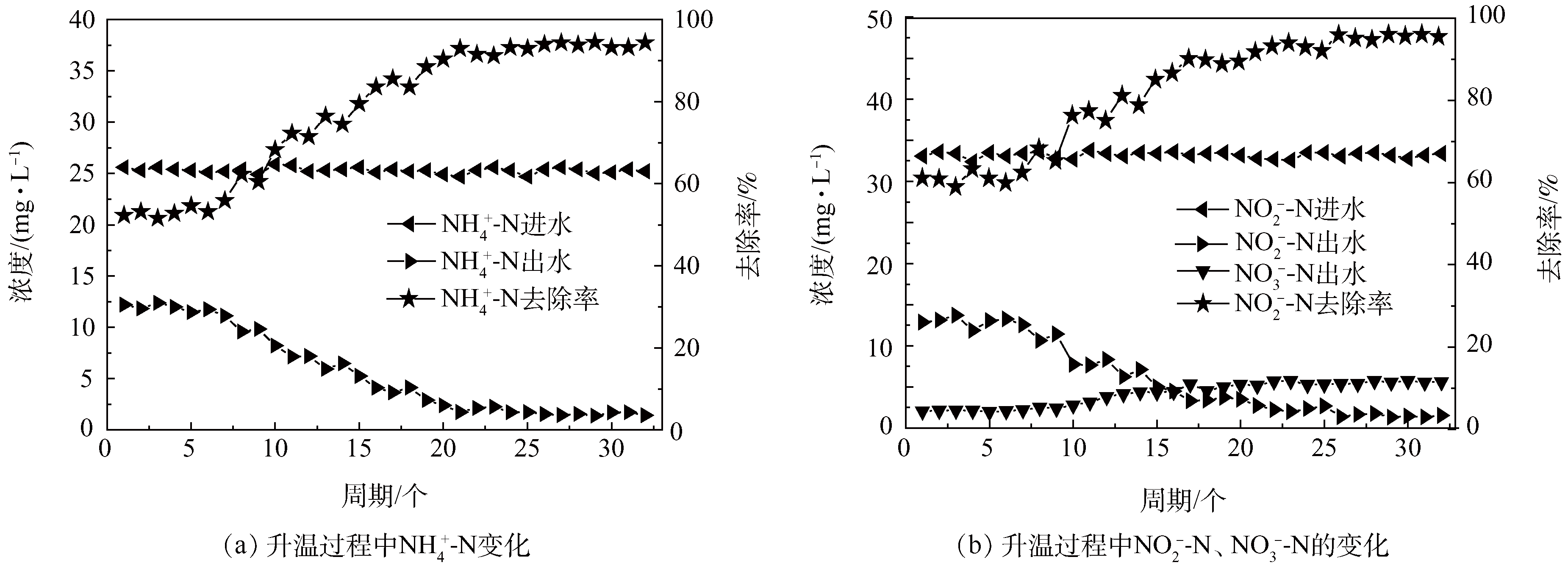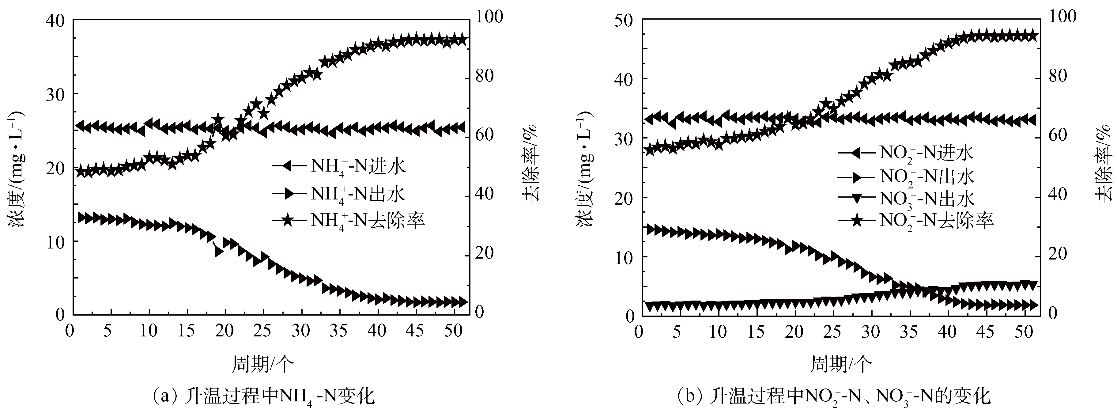 圖7和圖8為一次性降溫反應器和階梯式降溫反應器升溫過程中NH4+-N、NO2−-N和NO3−-N的變化。將一次性降溫到15 ℃的反應器再一次性升溫至30 ℃時?梢钥闯,在1~15周期時,出水NH4+-N和NO2−-N的平均濃度分別為12.5 mg·L−1和13.8 mg·L−1,其去除率分別達到50.8%和58.5%,出水NO3−-N平均濃度為2.0 mg·L−1;第41周期時出水NH4+-N和NO2−-N濃度逐漸下降至2.3 mg·L−1和2.8 mg·L−1,出水NO3−-N濃度逐漸升高至4.6 mg·L−1;44周期后,出水NH4+-N和NO2−-N濃度分別穩定為1.7 mg·L−1和1.9 mg·L−1,二者去除率分別為93.0%和94.3%,出水NO3−-N濃度為5.3 mg·L−1。將階梯式降溫到15 ℃的反應器一次性升溫至30 ℃。可以看出,在1~9周期時,出水NH4+-N和NO2−-N的平均濃度為11.5 mg·L−1和12.5 mg·L−1,NH4+-N和NO2−-N的去除率分別為55.1%和57.5%,出水平均NO3−-N濃度為2.6 mg·L−1,第23周期,出水NH4+-N和NO2−-N濃度逐漸下降至2.3 mg·L−1和2.7 mg·L−1,出水NO3−-N濃度逐漸升高至5.3 mg·L−1,26周期后,出水NH4+-N、NO2−-N和NO3−-N濃度均達到穩定,出水NH4+-N和NO2−-N濃度為1.5 mg·L−1和1.6 mg·L−1,去除率分別為94.0%和95.5%,出水NO3−-N濃度為5.6 mg·L−1?梢2種降溫方式下的反應器再經一次性升溫時其脫氮性能均不能在短時間內恢復。而階梯式降溫反應器經過30周期的恢復,其脫氮性能接近于最初30 ℃時的脫氮性能,一次性降溫反應器經過44周期的恢復才接近最初30 ℃時的脫氮性能。姚俊芹等研究發現,反應器在17 ℃停運2個月后,直接升溫31 ℃開始再次運行,第17天時,NH4+-N、NO2−-N的最高去除率就達到99.4%、90.6%,表明僅僅經歷較短時間,反應器內微生物SAA便得到恢復。