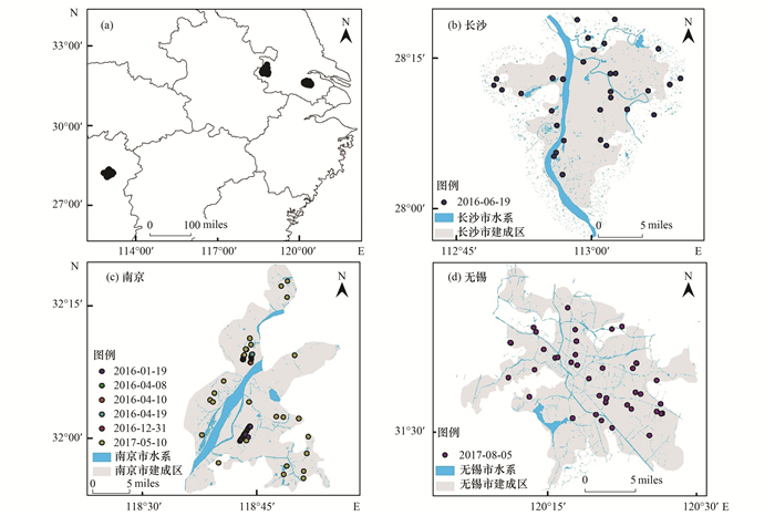 2016~2017年在長沙、南京、無錫進行地面遙感實驗, 采集水樣并進行水質參數和水體吸收系數測量.樣點分布見圖 1, 采樣時間與采樣數量見表 1.