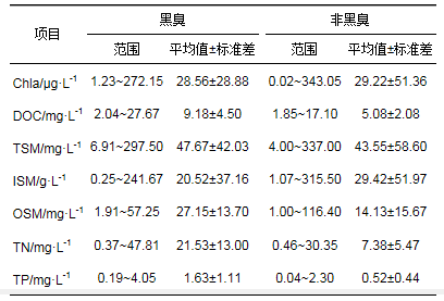 (1) 與非黑臭水體相比, 黑臭水體具有有機懸浮物濃度、總氮、總磷濃度和可溶性有機碳濃度較高的特點, 而兩者葉綠素a濃度較為接近.