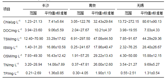 表 4為2016~2017長沙、南京和無錫這3個城市實測的黑臭水體的水質參數.不同城市黑臭水體的Chla濃度也略有差異.無錫黑臭水體的Chla濃度均值最高[(80.61±90.13) μg·L-1], 變化范圍較大.可能的原因是無錫的多條河流與太湖相連通, 而采樣時間處于夏季, 該季節太湖的浮游藻類較多導致河道中Chla濃度增大.長沙、南京和無錫市黑臭水體中的DOC濃度與懸浮物濃度較為接近.其中, 南京黑臭水體的有機懸浮物占比最高, 達到62%, 無錫黑臭水體的有機懸浮物占比最低, 僅為36%.南京市黑臭水體中的總氮濃度最高, 均值達到(26.00±12.60)mg·L-1, 明顯高于長沙市[(14.08±7.89)mg·L-1]和無錫市[(9.69±5.27)mg·L-1]的總氮濃度均值.3個城市黑臭水體的水質參數存在一定的差異, 但并無明顯的區域性特點.