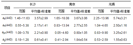 不同城市間黑臭水體的吸收系數差異較小(表 5), 但是其主要影響因素不同, 長沙與南京兩市以非色顆粒物吸收占主導, 而無錫市則是色素顆粒物吸收比例較高, 這與太湖的浮游藻類較多有一定關系.不同城市的吸收系數光譜特征并未呈現明顯的區域性特點, 因而在之后的分析中將各城市樣點混合在一起進行討論.