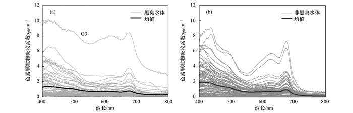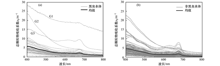 圖 3為黑臭水體與非黑臭水體的色素顆粒物吸收系數光譜曲線, 加粗的曲線是色素顆粒物平均吸收系數光譜曲線.色素顆粒物吸收曲線由葉綠素a和其他輔助色素濃度決定.在450~550 nm范圍內, 吸收系數隨著波長的增加而降低.與非黑臭水體相比, 黑臭水體在400~550 nm范圍內的變化趨勢更為平緩, 其色素顆粒物吸收系數均值較低.黑臭水體與非黑臭水體在675 nm處的范圍是0.01~8.45 m-1、0.01~7.25 m-1, 平均值分別為(0.77±1.16)m-1、(1.96±1.16)m-1.圖 2中吸收系數偏高的G3號點在圖 3中同樣表現突出, 其值遠遠高于其它黑臭水體的吸收系數.此外, 圖 2中呈現較明顯的雙峰(440 nm和675 nm)吸收特征的樣點, 說明采樣區水體含有較多藻類顆粒物.