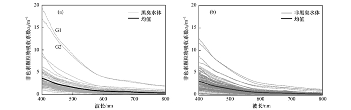 (a)黑臭水體, G3是8月5日在無錫市采集的重度黑臭水體; (b)非黑臭水體圖 3 黑臭與非黑臭水體色素顆粒物吸收系數光譜曲線2.2.3 非色素顆粒物吸收特征