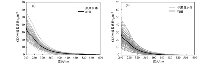 CDOM主要由陸源有機物質的輸入和內源浮游植物的降解形成, 在紫外和藍光波段有較強的吸收, 隨著波長增大, 吸收迅速減小.不同水體的CDOM吸收系數在短波處的差異較大, 通常用440 nm處的吸收系數來表征CDOM濃度.圖 5為240~600 nm波段范圍內的黑臭水體與非黑臭水體的CDOM吸收光譜曲線, 黑色加粗的曲線是CDOM平均吸收系數光譜曲線.CDOM的吸收光譜曲線隨波長增加呈現指數衰減的規律.黑臭和非黑臭水體在440 nm處的CDOM吸收系數ag(440)范圍分別在0.18~2.94 m-1和0.04~2.21 m-1, 均值分別是(1.72±0.63)m-1和(1.00±0.39)m-1.比較440 nm處的吸收系數的平均值可以看出, 黑臭水體的CDOM吸收系數比非黑臭水體的吸收系數高出1.7倍左右.