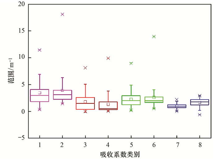 1、2分別對應非黑臭水體與黑臭水體在440 nm處的總顆粒物吸收系數, 3、4對應色素顆粒物吸收系數, 5、6對應非色素顆粒物吸收系數, 7、8對應CDOM吸收系數圖 6 顆粒物吸收系數與CDOM吸收系數在440 nm處的箱型圖2.3.2 基于CDOM吸收系數參數化模型的黑臭水體可分性分析
