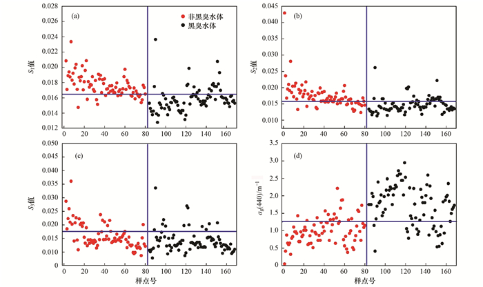 圖 7是黑臭與非黑臭水體斜率值和ag(440)的散點圖.對于圖 7(a), 以S1=0.0165為閾值劃線時, 165個樣點數據中, 非黑臭水體有81%的樣點位于直線上方, 黑臭水體中有78%的樣點位于直線下方, 由此說明, 當以0.0165為閾值進行區分時, 正確識別非黑臭水體65個、黑臭水體66個, 區分的正確率可達79.39%;對于圖 7(b), 以S2=0.016為閾值劃線時, 165個樣點數據中, 非黑臭水體有66%的樣點位于直線上方, 黑臭水體中有78%的樣點位于直線下方, 由此說明, 當以0.016為閾值進行區分時, 正確識別非黑臭水體53個、黑臭水體66個, 區分的正確率可達72.12%;對于圖 7(c), 以S3=0.0175為閾值劃線時, 165個樣點數據中, 非黑臭水體有30%的樣點位于直線上方, 黑臭水體中有90%的樣點位于直線下方, 由此說明, 當以0.0175為閾值進行區分時, 正確識別非黑臭水體24個、黑臭水體72個, 區分的正確率可達58.18%;對于圖 7(d), 以ag(440)=1.25為閾值劃線時, 165個樣點數據中, 非黑臭水體有76%的樣點位于直線下方, 黑臭水體中有81%的樣點位于直線上方, 由此說明, 當以1.25為閾值進行區分時, 正確識別非黑臭水體61個、黑臭水體65個, 區分的正確率可達76.36%.從以上分析可以看出, 利用S1和ag(440)對黑臭和非黑臭水體有較高的區分度, 而不同斜率值對兩類水體的區分度則隨著波長的增加而降低.