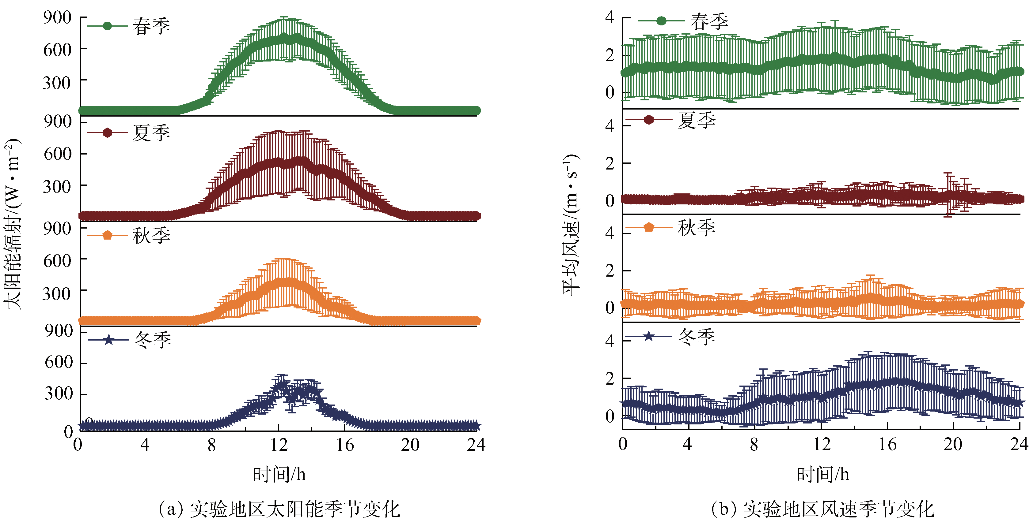 由圖3(b)可知,夏季和秋季風(fēng)資源相對匱乏,而春季和冬季風(fēng)力資源較為豐富,特別是在冬季,平均風(fēng)速均可達(dá)到1 m·s−1以上。此外,春季白天風(fēng)速較高,峰值出現(xiàn)在15:00左右;夏、秋兩季日變化幅度較小;冬季風(fēng)速日變化波動(dòng)較大且維持在較高水平,風(fēng)力最大值出現(xiàn)在16:00—18:00時(shí)之間。作為輔助能源,冬季相對豐富的風(fēng)力資源對于冬季相對較弱的太陽能資源將是良好的補(bǔ)充。