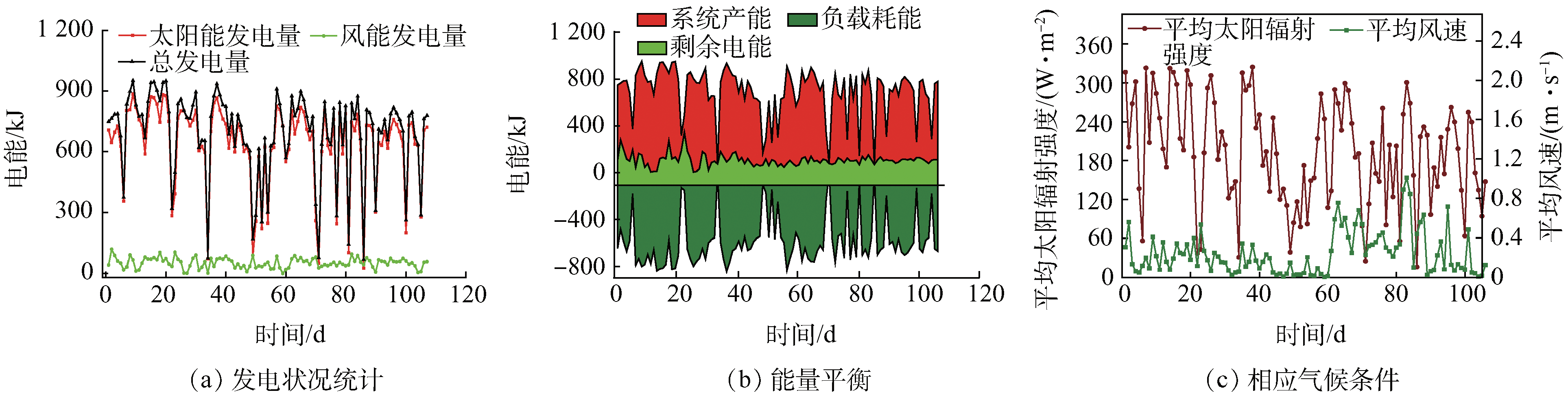 在實(shí)驗(yàn)期間,對生物反應(yīng)器運(yùn)行穩(wěn)定后光伏發(fā)電板和風(fēng)力發(fā)電機(jī)的發(fā)電能力、發(fā)電量、負(fù)載(生物反應(yīng)器)的耗電量以及相對應(yīng)的氣象條件進(jìn)行了連續(xù)監(jiān)測,結(jié)果如圖4所示。