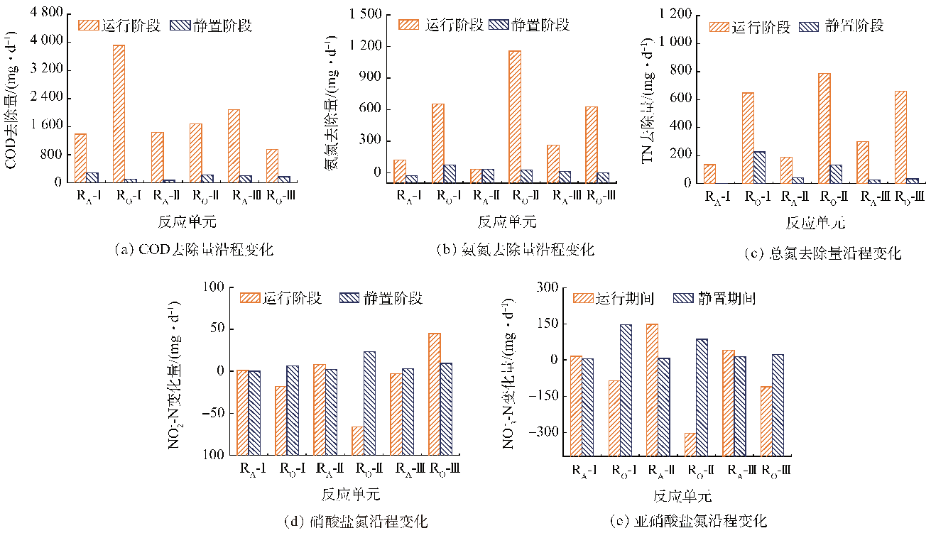 由圖6(a)可見,COD總?cè)コ繛?2 473.0 mg·d−1,其中運(yùn)行階段去除量為11 434.9 mg·d−1,占總?cè)コ康?1.6%,靜置階段去除量較小,僅占總?cè)コ康?.3%。COD的去除主要發(fā)生在RO-I反應(yīng)區(qū),反應(yīng)器運(yùn)行期間對COD去除量和貢獻(xiàn)率分別為3 910.7 mg·d−1和31.3%,當(dāng)電力供應(yīng)不足,反應(yīng)器處于靜置狀態(tài)時(shí),仍然可以繼續(xù)對污水中的COD進(jìn)行一定的去除,靜置期間的去除量和貢獻(xiàn)率分別為105.0 mg·d−1和0.8%,RO-I反應(yīng)區(qū)的總貢獻(xiàn)率高達(dá)32.1%,其余各階段對COD的去除貢獻(xiàn)率在14.0%左右。圖6(b)、(c)、(d)、(e)分別是NH4+-N、TN、NO2−-N和NO3−-N的變化結(jié)果。NH4+-N總?cè)コ繛? 961.0 mg·d−1,其中運(yùn)行階段去除量2 853.3 mg·d−1,占總?cè)コ康?6.3%,靜置階段去除量同樣較少,占總?cè)コ康?.6%。NH4+-N主要在RO-I、RO-II、RO-III中去除,其中在RO-II中的去除效果最好,反應(yīng)器運(yùn)行期間對NH4+-N去除量和貢獻(xiàn)率分別為1 156.0 mg·d−1和39.0%;反應(yīng)器靜置期間對NH4+-N的去除量和去除率分別為22.9 mg·d−1和0.7%。RO-I和RO-III在反應(yīng)器運(yùn)行和靜置狀態(tài)下的總?cè)コ暙I(xiàn)率分別為24.4%和21.2%。在反應(yīng)器靜置期間,各反應(yīng)單元內(nèi)NH4+-N無明顯變化。TN總?cè)コ繛? 953.5 mg·d−1,其中運(yùn)行階段去除量2 522.4 mg·d−1,占總?cè)コ康?6.33%,靜置階段去除量431.1 mg·d−1,占總?cè)コ康?3.6%。TN的變化趨勢與NH4+-N基本相同。NO3−-N 的積累主要發(fā)生在好氧段,在厭氧段下降。NO2−-N的積累主要發(fā)生在RO-II中,并且在反應(yīng)器靜置階段以及RO-III得以去除,最終沒有發(fā)生明顯的積累。