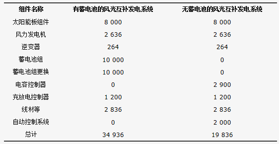發(fā)電系統(tǒng)中的各組件成本如表2所示。通過對比無蓄電池的風(fēng)光互補(bǔ)發(fā)電系統(tǒng)以及傳統(tǒng)的風(fēng)光互補(bǔ)發(fā)電系統(tǒng)的基礎(chǔ)建設(shè)費(fèi)用得出,無蓄電池的風(fēng)光互補(bǔ)發(fā)電系統(tǒng)總成本相對于傳統(tǒng)帶有蓄電池的風(fēng)光互補(bǔ)系統(tǒng)降低了43.2%。