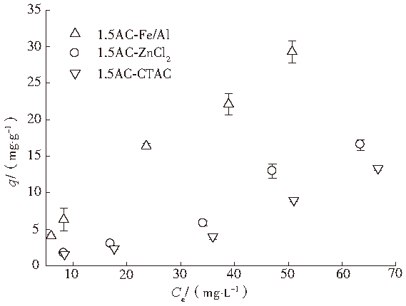 圖1 是3種不同方法改性活性炭的磷吸附等溫線,可以看出1.5AC-Fe/Al的吸附量高于其他2種改性活性炭。在平衡濃度均為50 mg·L−1左右時,1.5AC-Fe/Al的磷吸附量約為另兩者的2~3倍。載體改性活性炭(1.5AC-Fe/Al)擁有最高的吸附量意味著其表面的納米Fe/Al(氫)氧化物能充分發揮金屬氫氧化物對磷有高吸附性能的優勢。在低磷濃度下,1.5AC-ZnCl2和1.5AC-CTAC的吸附差異不明顯,但在高磷濃度(Ce>30 mg·L−1)時,1.5AC-ZnCl2展現出相對較高的吸附能力,這可能與1.5AC-ZnCl2表面物理結構變化和孔徑增大有關。