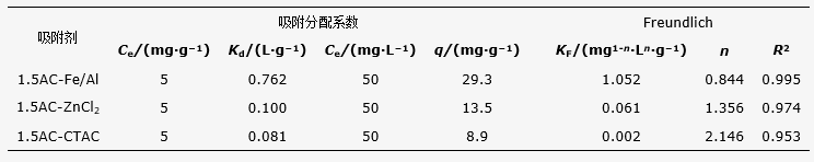 表1是Freundlich模型擬合參數和Kd值,從相關系數R2值可看出表面修飾活性炭吸附磷符合Freundlich模型。在平衡濃度為5 mg·L−1時,1.5AC-Fe/Al、1.5AC-ZnCl2和1.5AC-CTAC的Kd值依次是0.762、0.100和0.081L·g−1,Kd值越高吸附能力越強,表1與圖1一致顯示3種吸附劑中對磷吸附能力最強的是1.5AC-Fe/Al。
