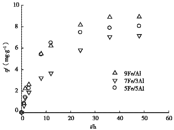 為確定制備納米Fe/Al顆粒的較優鐵鋁比率,分別稱取0.1 g 制備的3種9Fe/Al、7Fe/3Al、5Fe/5Al材料于一系列聚乙烯塑料瓶中,分別加入100 mL質量濃度為10 mg·L−1的KH2PO4溶液,密封置于恒溫振蕩器內,其他條件同前。每隔一定時間(0、1.5、3、8、12、24、36和48 h)取上清液,過膜后測定溶液中的磷濃度。