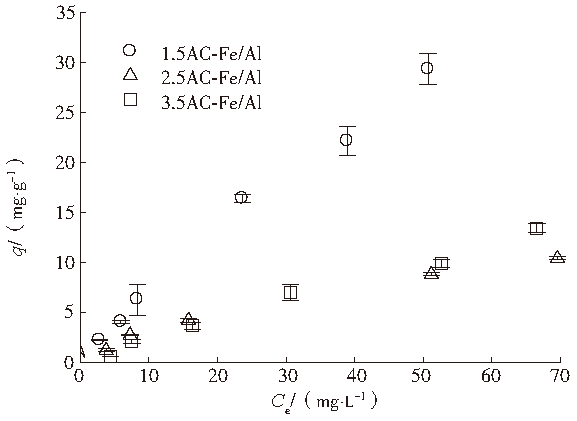 圖3 不同Fe/Al和炭配比的修飾活性炭對磷的吸附等溫線