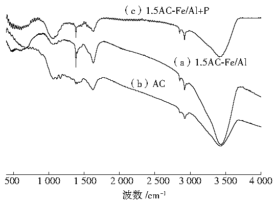 EDX結果顯示,材料1.5AC-Fe/Al表面碳元素的含量約63.2%,表明該材料主要成分還是活性炭,Fe和Al的元素含量約19.9%和1.55%,Fe和Al比率為12.8:1,接近添加時的比例。從圖4中可以清晰觀察到改性材料的形態。Fe/Al(氫)氧化物分散在了活性炭表面和孔徑中,這表明納米Fe/Al(氫)氧化物已成功負載于活性炭表面,為磷的吸附提供了大量有效吸附位點,同時,AC-Fe/Al粗糙的表面也有利于吸附磷。結合圖3可知,1.5AC-Fe/Al較2.5AC-Fe/Al和3.5AC-Fe/Al而言,單位AC表面應負載有更多Fe/Al(氫)氧化物,所以它有更多高效吸附位點。