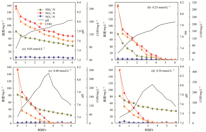 圖 3 不同海藻糖濃度下典型周期內氮去除過程當海藻糖濃度為0.4 mmol ·L-1和0.5 mmol ·L-1時, 單周期內pH值均出現了先升高然后在反應時間3.5 h后下降的現象. NO2--N消耗盡的點剛好為pH下降的點, NO2--N消耗盡時, ANAMMOX和反硝化反應停止, pH下降可能是由于NH4+和游離氨(FA)之間的化學平衡導致, OH-消耗使得反應器內pH值下降.另外, FA的形成會在一定程度上抑制ANAMMOX過程, 從而使得pH下降. ANAMMOX由于沒有NO2--N可利用, 使得反應器內的剩余NH4+-N不能被完全轉化.出現上升的原因可能是因為SBR系統中存在其他形式的氮轉化反應.文獻報道稱AnAOB能夠表現出異化作用即揮發性脂肪酸(VFA)氧化以硝酸鹽作為中間產物將NO2--N轉化為NH4+-N(DNRA).在批次實驗中, 富集的ANAMMOX和自養菌可以表現出高效率的DNRA耦合ANAMMOX反應, 從而使得NH4+-N濃度上升.