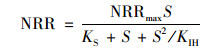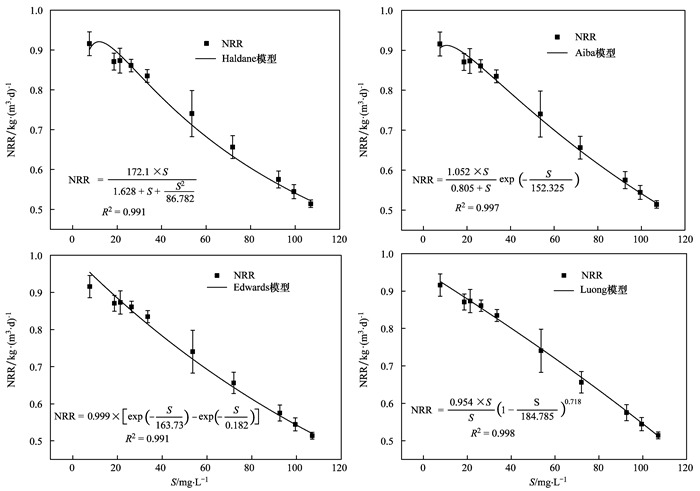 式中, NRRmax為最大基質轉化速率, kg ·(m3 ·d)-1; S為出水基質濃度, mg ·L-1; KS為半飽和常數, mg ·L-1; KIH為Haldane動力學常數, mg ·L-1.