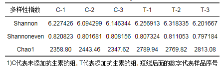 在未添加抗生素前(C組)和添加抗生素兩個月后(T組)分別取3份最上層基質進行16S rRNA測序分析, 每次取樣間隔1 d, 取樣深度為表面下4~5 cm.樣品中的DNA提取采用Fast DNA SPIN Kit For Soil(MP Biotechnology)試劑盒完成.采用引物338F和806R對V3-V4可變區進行PCR擴增, 反應條件為95℃預變性3 min, 95℃變性0.5 min, 55℃退火0.5 min, 72℃延伸0.5 min, 循環27次, 并在72℃最終延伸5 min.擴增產物用2%瓊脂糖凝膠電泳進行質量檢測, 然后在Illumina MiSeq平臺完成測序分析.測序由美吉生物醫藥公司完成.測序結果按照97%的相似度進行OTU分類, 采用RDP classfier進行分類學統計, 然后計算每組樣本的Shannon指數、Shannoneven指數和Chao1指數.采用非度量多維尺度分析(non-metric multidimensional scaling, NMDS)判斷兩組樣本整體差異.顯著性水平為P < 0.05.