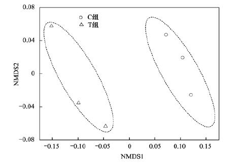 測序后得到各分類水平的微生物數目如圖 3所示, 樣本的Shannon指數、Shannoneven指數、Chao1指數如表 1所示.對比兩組結果發現, T組樣本的Chao1指數顯著高于C組, 但Shannon指數和Shannoneven指數變化并不顯著(P>0.05)(表 1). NMDS分析結果(如圖 4)顯示, 不同組樣本點間距離較大, 同組樣本點間距離較小, 兩組樣本點呈現明顯分離趨勢.可見, 氟喹諾酮確實使系統中的微生物群落產生了轉變.