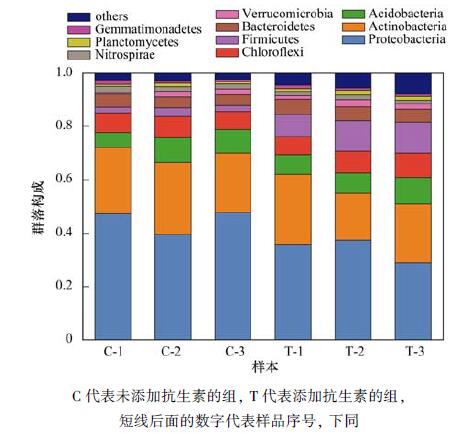 抗生素添加前后各樣本的門水平微生物群落構成如圖 5所示, 其中C組的優勢種群為Proteobacteria (44.90%)、Actinobacteria (24.61%)、Chloroflexi (7.37%)、Acidobacteria (7.93%)、Bacteroidetes (4.37%), T組的優勢種群為Proteobacteria (34.12%)、Actinobacteria (21.82%)、Firmicutes (10.55%)、Acidobacteria (8.31%)、Chloroflexi (7.99%)和Bacteroidetes (5.25%). Proteobacteria、Actinobacteria、Chloroflexi、Acidobacteria與Bacteroidetes始終為優勢種群, 其總豐度在C組和T組中分別占比89.17%、77.49%, 這與其他研究中的結果類似.具體聯系污水寶或參見http://www.bnynw.com更多相關技術文檔。