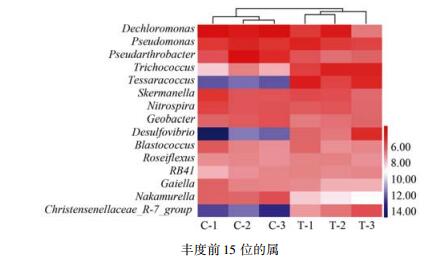 本實驗中, C組和T組分別檢測到585個屬和670個屬, 其中551個屬為兩組共有, 其中42.65%、15.79%、9.44%、7.26%、5.26%的屬分別包含于Proteobacteria、Actinobacteria、Bacteroidetes、Firmicutes、Chloroflexi.在屬的分類水平上, C組的優勢種群為Dechloromonas (8.56%)、Pseudarthrobacter (5.10%)、Pseudomonas(3.37%)、Skermanella (2.28%)、Nitrospira (2.03%), T組的優勢種群為Trichococcus (3.84%)、Tessaracoccus (3.83%)、Dechloromonas (3.16%)、Pseudomonas (3.15%)、Desulfovibrio (2.06%).兩組樣本中豐度前15位屬的Heatmap圖如圖 7所示, 從中可看出Dechloromonas(屬于Proteobacteria)、Pseudarthrobacter(屬于Actinobacteria)的豐度下降明顯, 而Trichococcus(屬于Firmicutes)、Tessaracoccus(屬于Actinobacteria)、Desulfovibrio(屬于Proteobacteria)的豐度則出現明顯上升, 因此群落中不同種類的微生物在氟喹諾酮壓力下呈現了不同的豐度變化趨勢.其中, Dechloromonas可以還原高氯酸鹽, 是生物水處理系統中常見的聚磷菌, 因此該屬豐度的減小可能與出水TP濃度上升有關.另一個豐度減小的屬Pseudarthrobacter中的部分菌種(如Pseudarthrobacter sulfonivorans strain Ar51)可在低溫下降解原油和多苯化合物, 但本實驗期間氣溫較高, 可能抑制了其對復雜有機物的適應能力. Trichococcus具有良好的抗生素適應性, Trichococcus flocculiformi更是在各類抗生素環境中廣泛存在的一類微生物, 因此該屬在氟喹諾酮的選擇性壓力下呈現了更高的豐度. Tessaracoccus是一類兼性厭氧(除T. lubricantis外)的革蘭氏陽性菌, 在活性污泥、海底沉積物、被油污染的含鹽土中均有被分離出來的菌株, 因此, 該屬對環境良好的適應能力使其未受到抗生素的負面影響. Desulfovibrio可以將有機物或者分子氫的氧化與硫酸鹽還原過程聯系起來生成硫化氫并從中獲得能量, 是嚴格厭氧菌.有報道顯示, 包括Desulfovibrio在內的多種硫酸鹽還原菌都可以受到環丙沙星的促進作用, 這與本實驗中的結果類似. Nitrosomonas和Nitrosospira是重要的氨氧化菌, 其豐度在前后兩組未出現較大變化, 這與出水氨氮濃度一直保持穩定狀態的結果相一致.