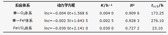 由圖1可知,當苯胺濃度為5.1 mg·L−1時,在Fe0/O2體系反應120 h后,苯胺可完全被去除,單一Fe0體系中苯胺去除率為22.27%,單一O2體系中苯胺去除率為19.04%。上述研究結果表明,Fe0/O2體系苯胺去除效果優于單一Fe0體系和單一O2體系。