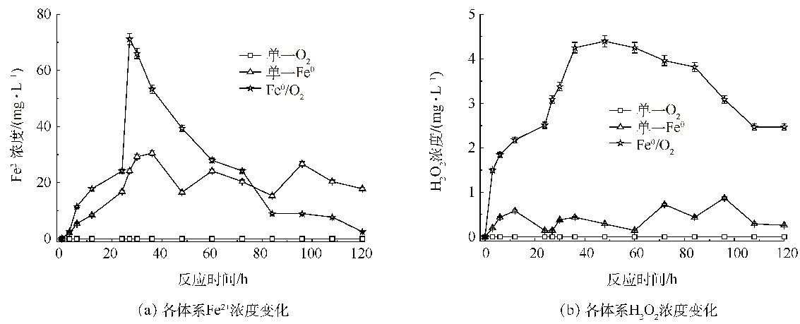 在圖2(b)中,可以觀察到各體系中H2O2含量的變化。單一O2體系中不存在電子供體,氧氣無法還原為H2O2,因而實驗過程中沒有觀察到H2O2的產生。單一Fe0體系中H2O2含量始終低于1 mg·L−1,Fe0/O2體系中H2O2含量在48 h前逐漸增加,隨后降低并穩定,48 h時取得最大值,為4.39 mg·L−1。