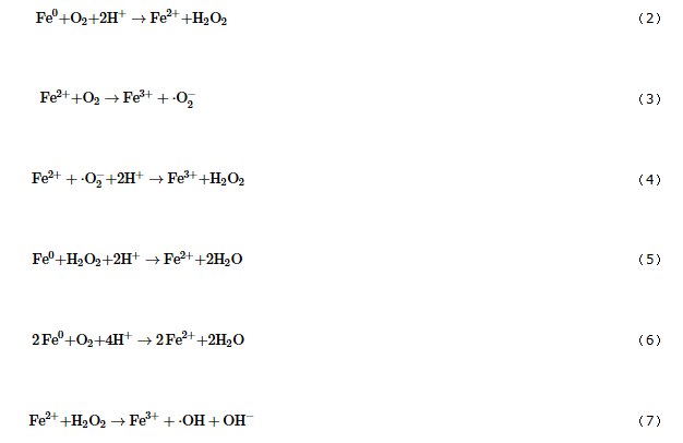 Fenton工藝已廣泛應用于芳香類有機物廢水降解,但傳統的Fenton試劑工藝需投加H2O2溶液,經濟成本高,且H2O2溶液具有腐蝕性,因而電Fenton和光助Fenton等工藝得到廣泛關注。但其也存在能耗高,成本較高的缺陷。近年來研究發現,零價鐵在有O2條件下,O2可還原生成H2O2,繼而與Fe2+反應產生·OH等活性氧化物(ROS)氧化降解有機物。Fe0/O2體系是集零價鐵的強還原性與體系產生的活性氧化物強氧化性于一體的污染降解體系,不同有機污染物在該體系中的降解途徑存在較大差異。