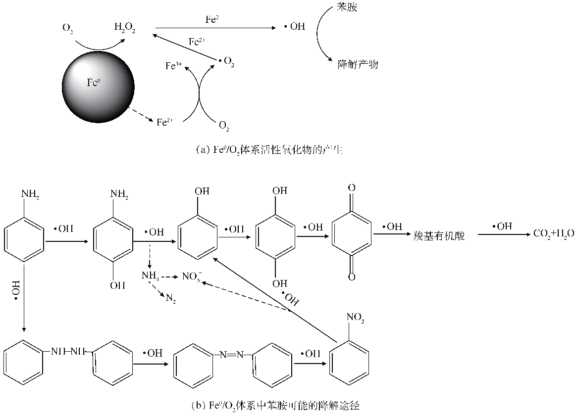 2)Fe0/O2體系中活性氧化物主要有H2O2和·OH等自由基,苯胺的降解以·OH氧化為主,其降解途徑為礦化和聚合,并以礦化為主。降解過程中苯胺可完全去除,但存在大量含氮有機物等中間產物。(來源:環境工程學報 作者:王亞娥)